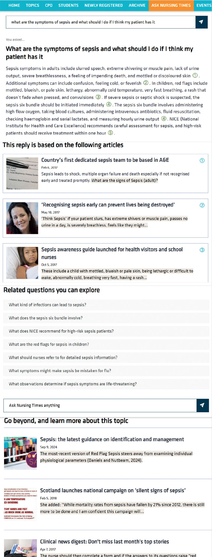 We harnessed the power of AI to give instant answers to users’ questions, exclusively from the Nursing Times’s trusted expert content. We inserted AI generated related questions in articles to encourage users to explore topics further. We allowed customers to ask their own questions.