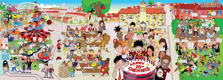 In a Beano first, all 75 mini mischief makers appear together on an eight-page fold-out cover, bringing to life an epic birthday street party.