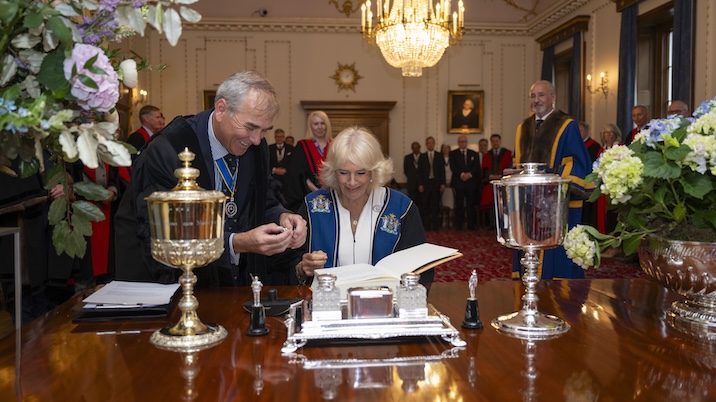 At a reception in the garden of Stationers’ Hall, Her Majesty met members and corporate members of the Stationers’ Company before departing from the Hall to a rousing round of ‘Three Cheers for Her Majesty Queen Camilla’ by staff, members and friends of the Stationers’ Company.